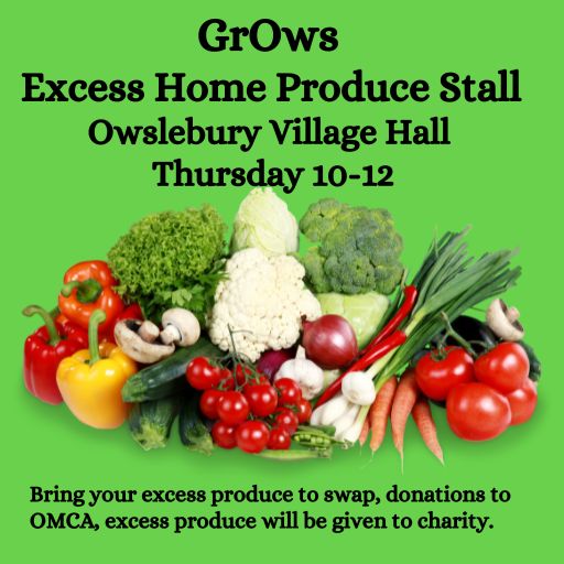 GrOws are aiming to start an excess Home Produce Stall during the most productive period in the Parish Hall foyer. It will be on a Thursday morning (Post Office open morning) from 10am-12pm. All that is needed is you to bring your excess vegetable donation and these will be on offer for a voluntary contribution to Owslebury village funds. If anything remains at the end of the session it will be offered on village social media.