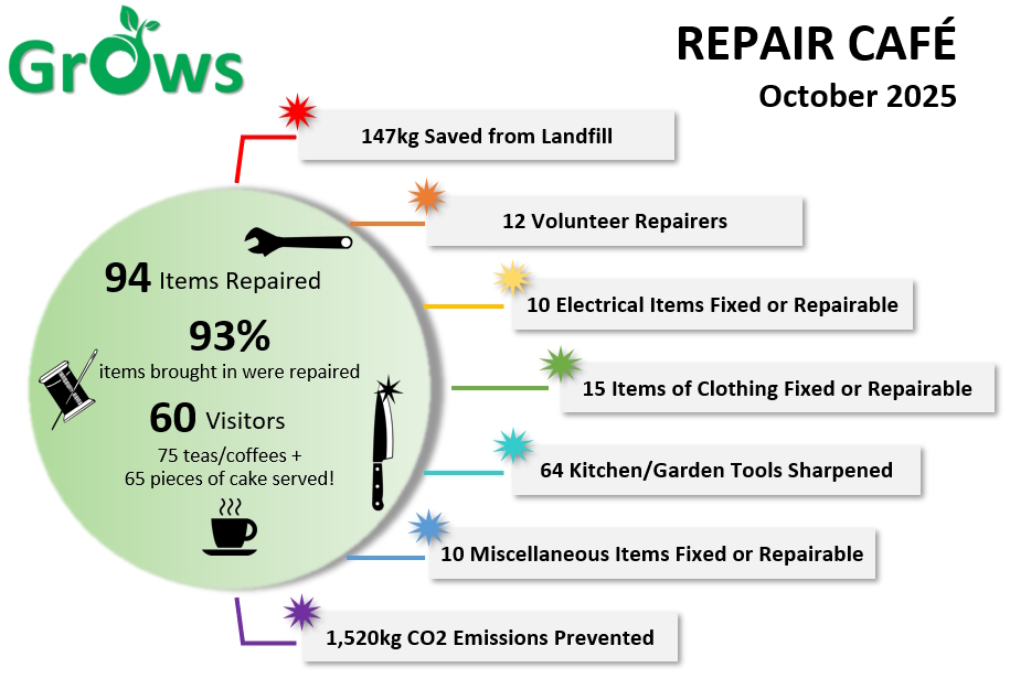 Items Repaired: 253; Kgs Saved from Landfill: 342kgs; Kgs of CO2 prevented: 2,735kgs